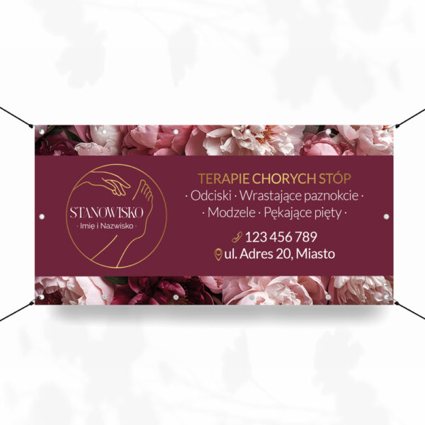 Bordowy baner reklamowy z ilustracją stopy i dłoni oraz logo w złotym kolorze. Baner reklamowy z botanicznym motywem polecamy do gabinetu podologicznego.