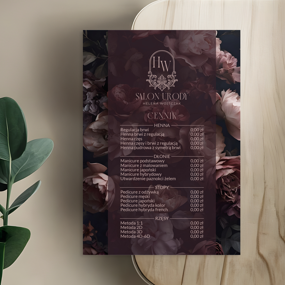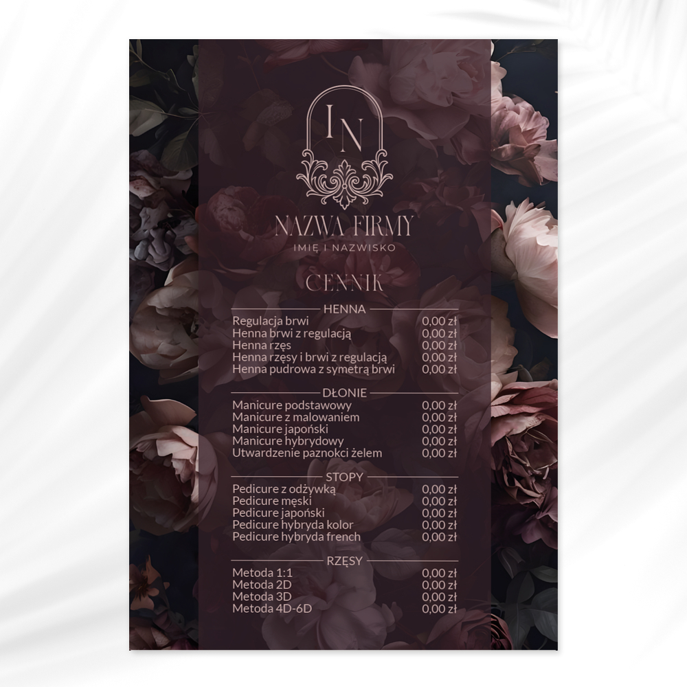 Cennik na ścianę z bordowymi kwiatami i logo z ozdobnymi ornamentami. Cennik zamówisz do swojego studia urody.