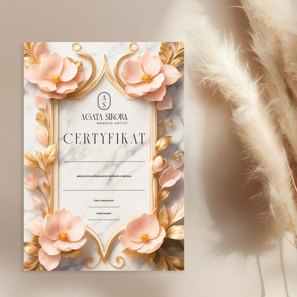 Certyfikaty szkoleniowe z owalnym logo i kwiatową ramką na tle białego marmuru. Certyfikaty zamówisz dla swoich kursantów jako dokument potwierdzający zdobytą wiedzę na szkoleniu.