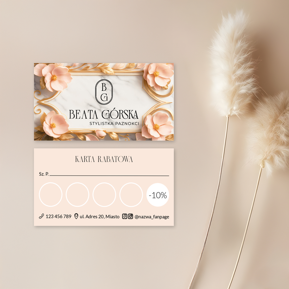 Karty rabatowe jasno-różowymi kwiatami i białym marmurkiem. Karty rabatowe polecamy jako skuteczne narzędzie marketingowe w salonie kosmetycznym i fryzjerskim.