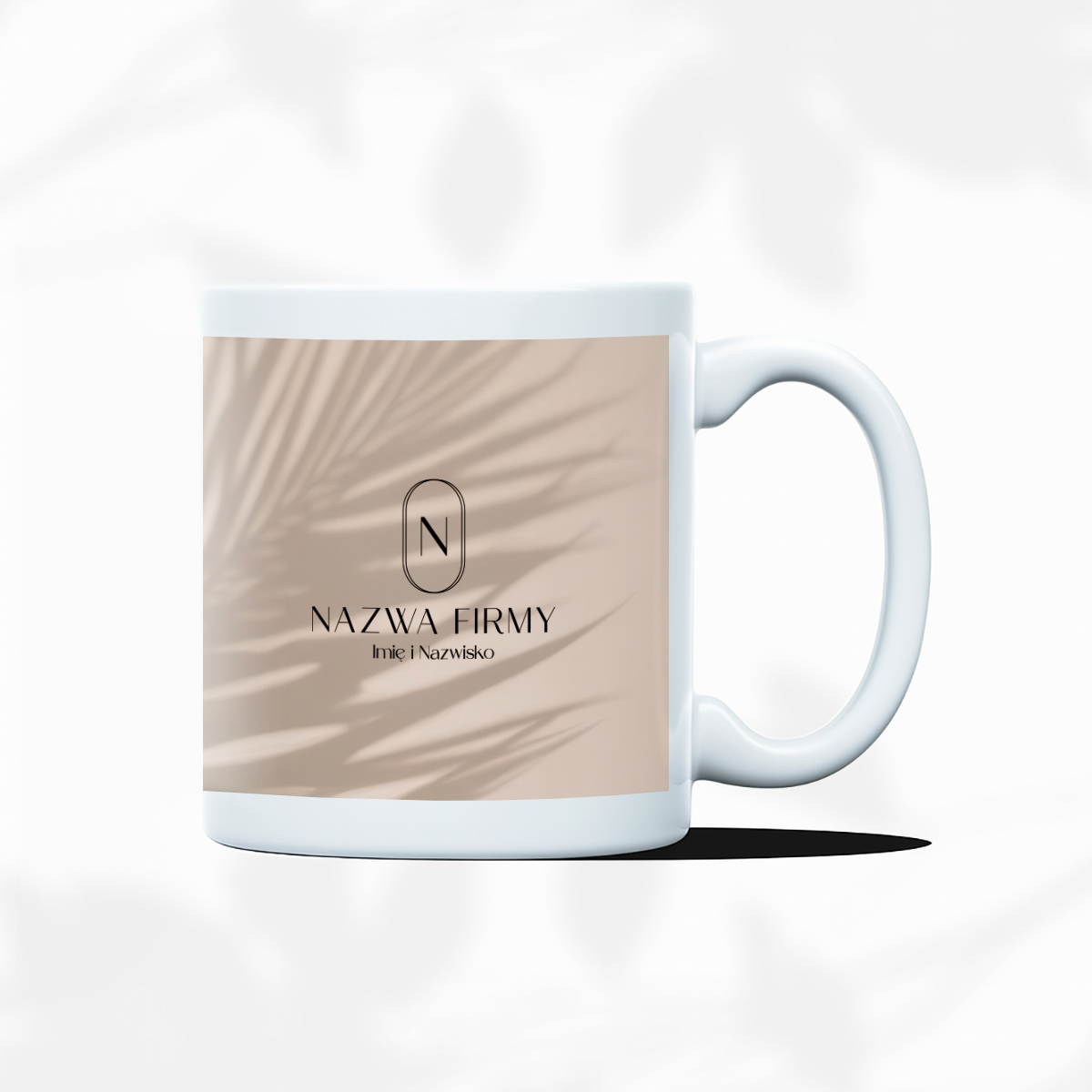 Kubek firmowy z delikatnym cieniem tropikalnych liści na beżowym tle to elegancki i subtelny dodatek do każdego salonu beauty. Nowoczesna grafika z owalnym logo nadaje mu profesjonalnego charakteru, a naturalna kolorystyka świetnie wpisuje się w estetykę firm z branży beauty.