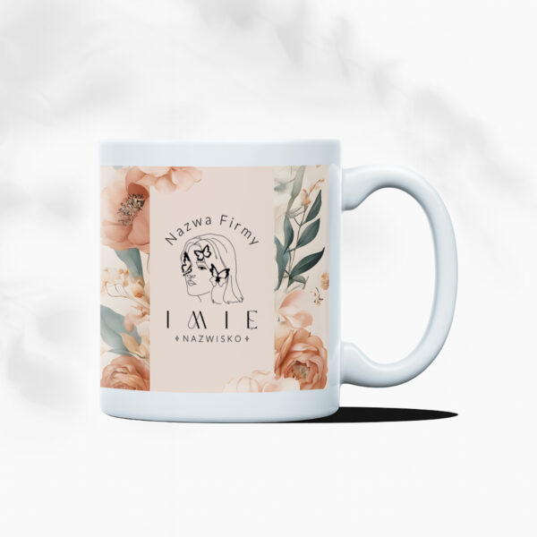 Kubek reklamowy z kwiatową ramką i portretem kobiety z motylami to subtelny, a zarazem wyrazisty dodatek do salonu kosmetycznego lub studia makijażu. Ilustracja nawiązuje do piękna, lekkości i kreatywności, co sprawia, że kubek nie tylko spełnia funkcję praktyczną, ale i wzmacnia wizerunek Twojej marki.