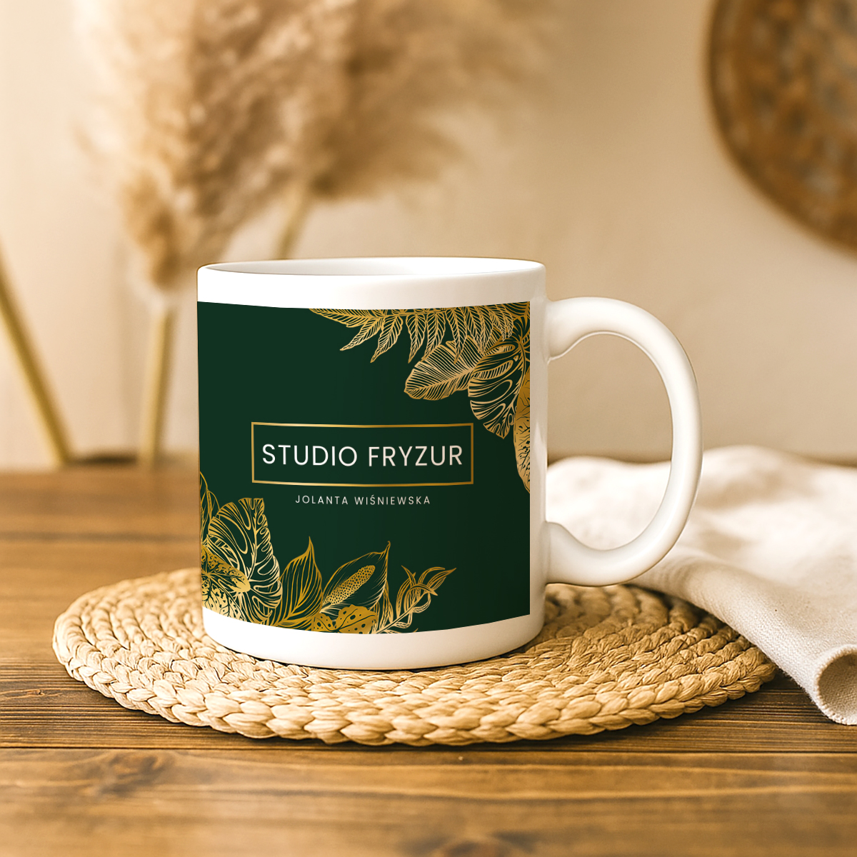 Botaniczny kubek firmowy z eleganckim logo w złotym kolorze na tle w kolorze butelkowej zieleni to subtelne i stylowe uzupełnienie Twojej marki beauty. Motyw liści w złotym kolorze dodaje projektowi klasy, a personalizacja imieniem i nazwiskiem czyni go idealnym gadżetem do salonu kosmetycznego, studia urody czy spa. To praktyczny i estetyczny element wizerunkowy, który podkreśla dbałość o detale.