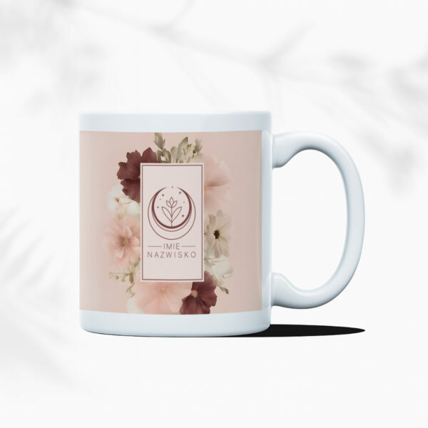Kubek z personalizowanym logo w kwiatowej ramce. Beżowe tło, subtelne kwiaty oraz motyw księżyca nadają mu wyjątkowy, kobiecy charakter. Idealny do salonu urody, dla stylistki paznokci lub jako upominek dla klientek. Estetyczny gadżet, który podkreśli profesjonalizm i dbałość o detale.