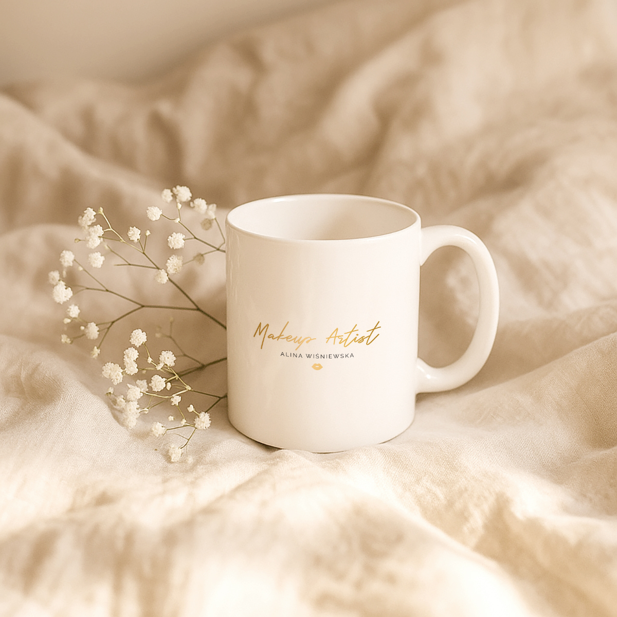 Personalizowane kubki z logo w złotym kolorze i delikatnym motywem ust to elegancki i kobiecy gadżet stworzony z myślą o salonach piękności oraz makijażystkach. Minimalistyczny projekt z subtelną typografią świetnie wpisuje się w estetykę branży beauty. Kubek sprawdzi się jako praktyczny element wyposażenia salonu, prezent dla klientki lub wyróżniający się rekwizyt do zdjęć w social mediach. Stylowy, funkcjonalny i pełen uroku — idealny detal dla Twojej marki.