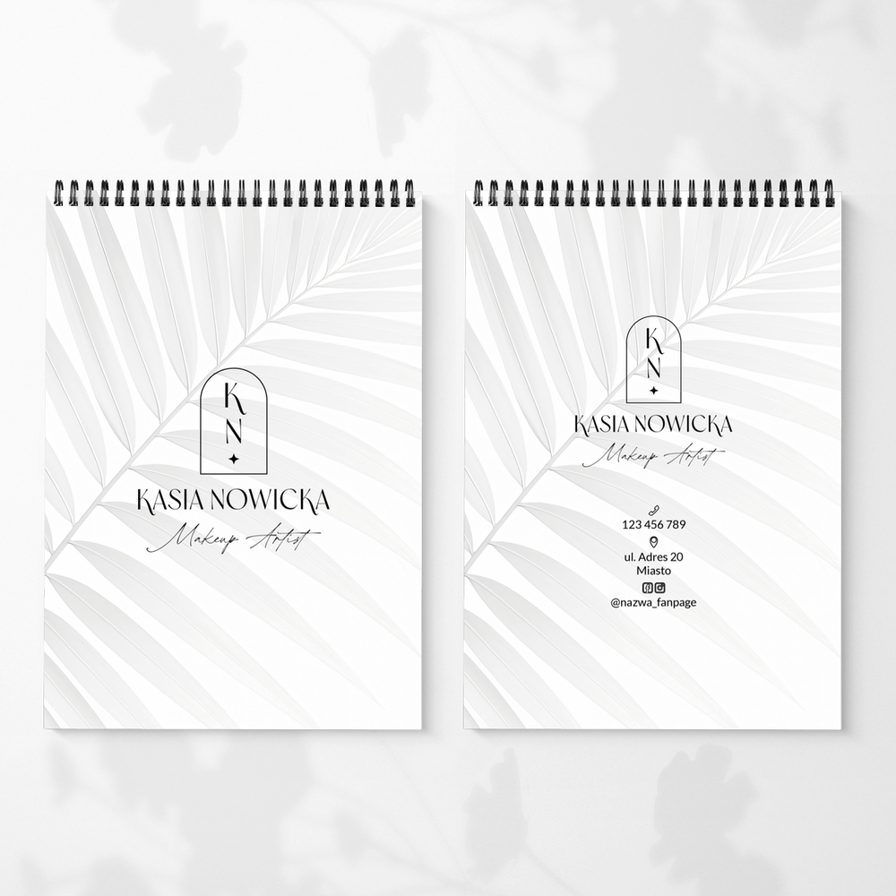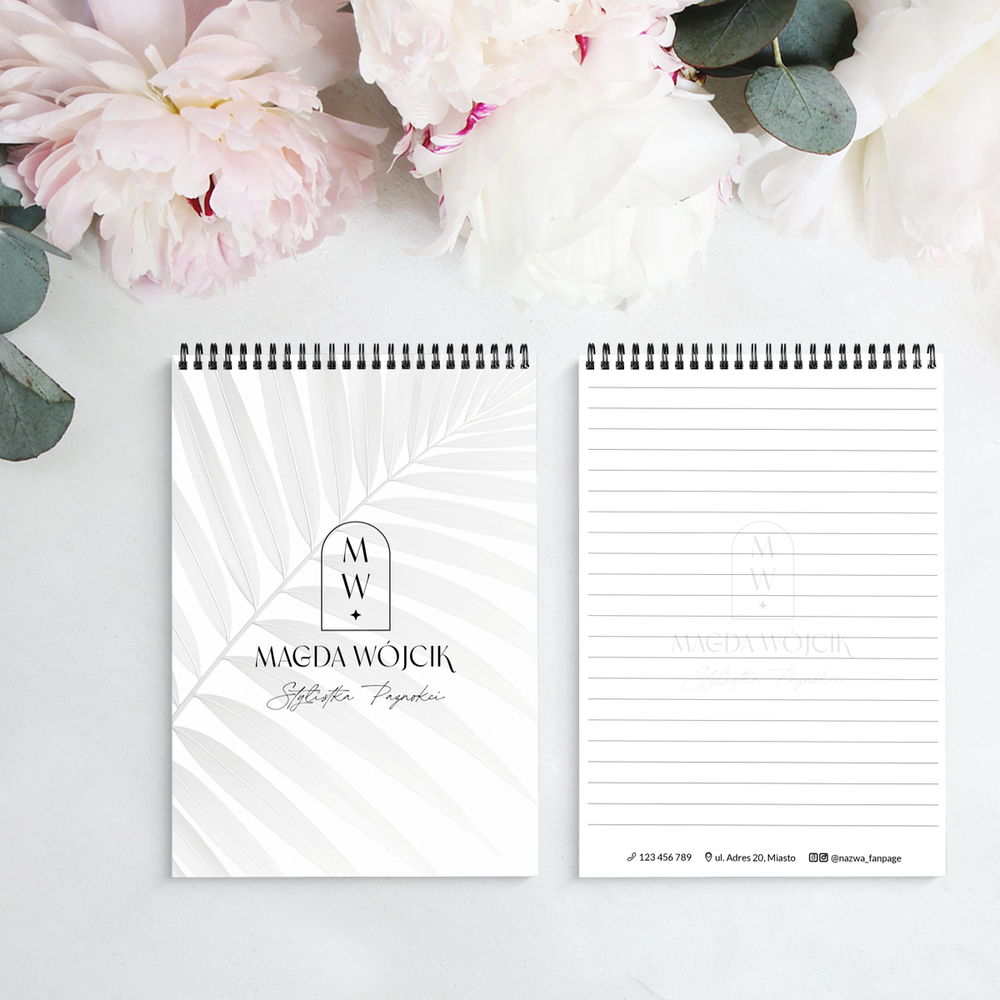 Personalizowany notes z logo w geometrycznej ramce na tle białego liścia. Notesy z logo przydadzą się na szkoleniach i jako prezent dla klientek.