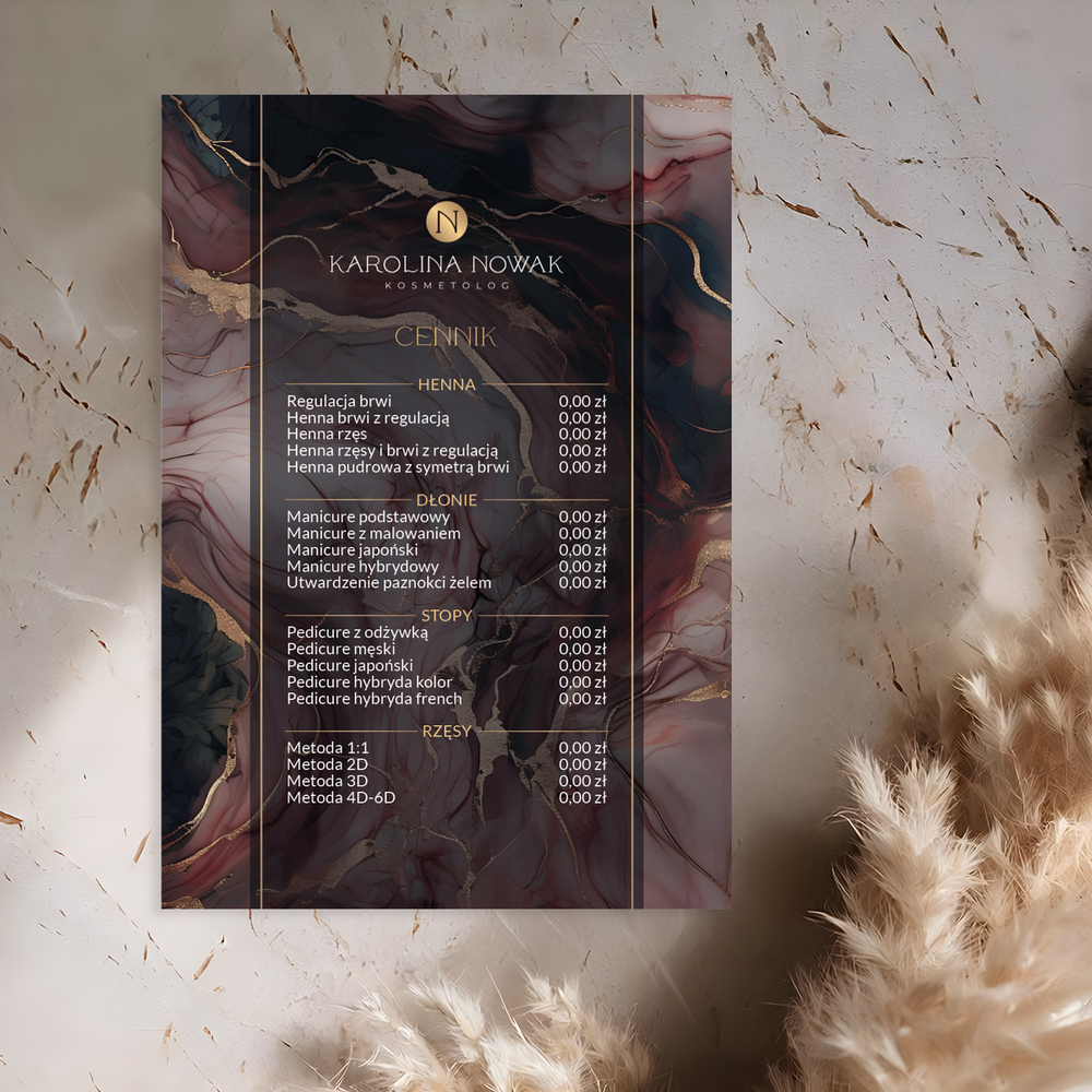 Plakat z listą usług z logo w złotym kolorze na tle ciemnego marmuru. Cennik zamówisz z lista swoich usług.