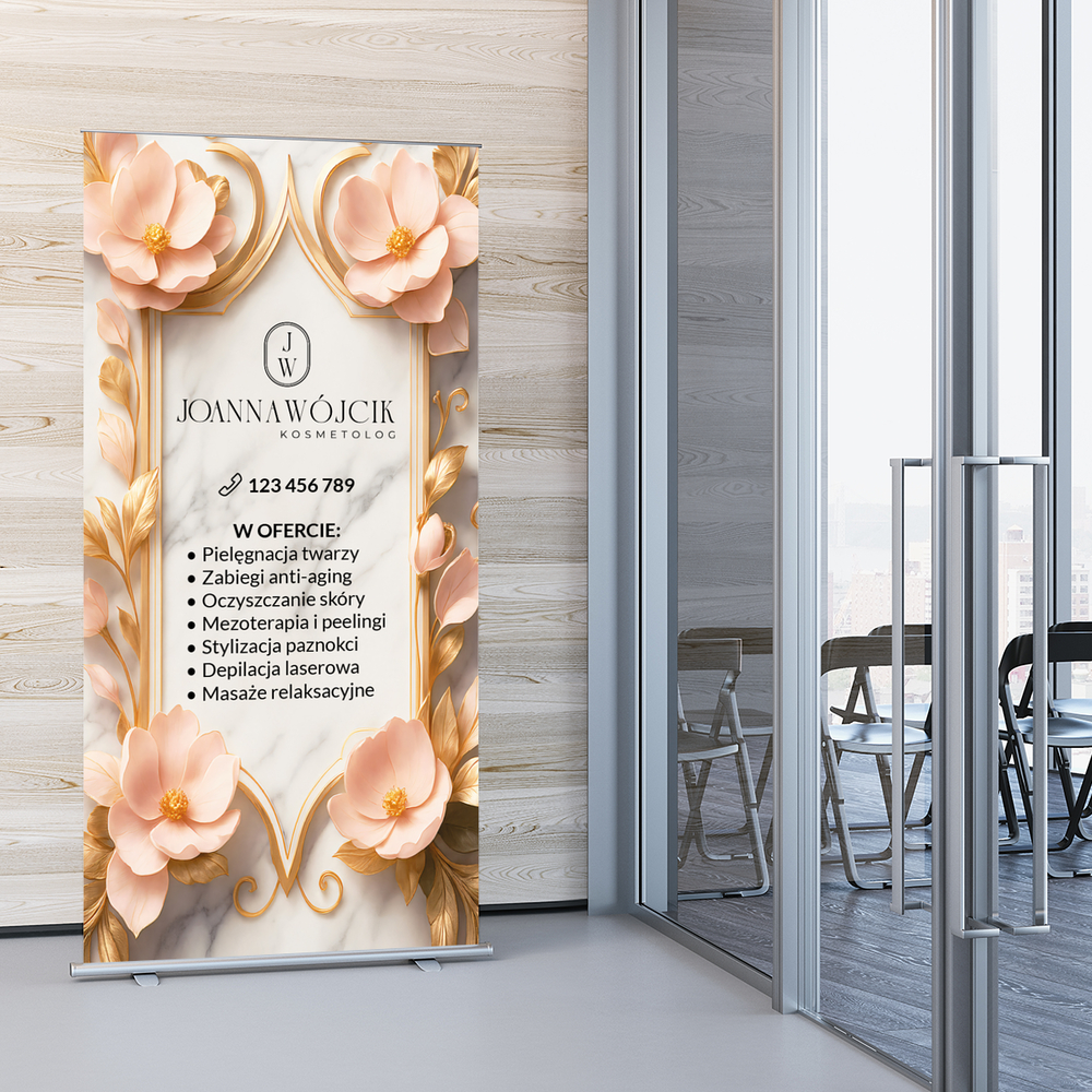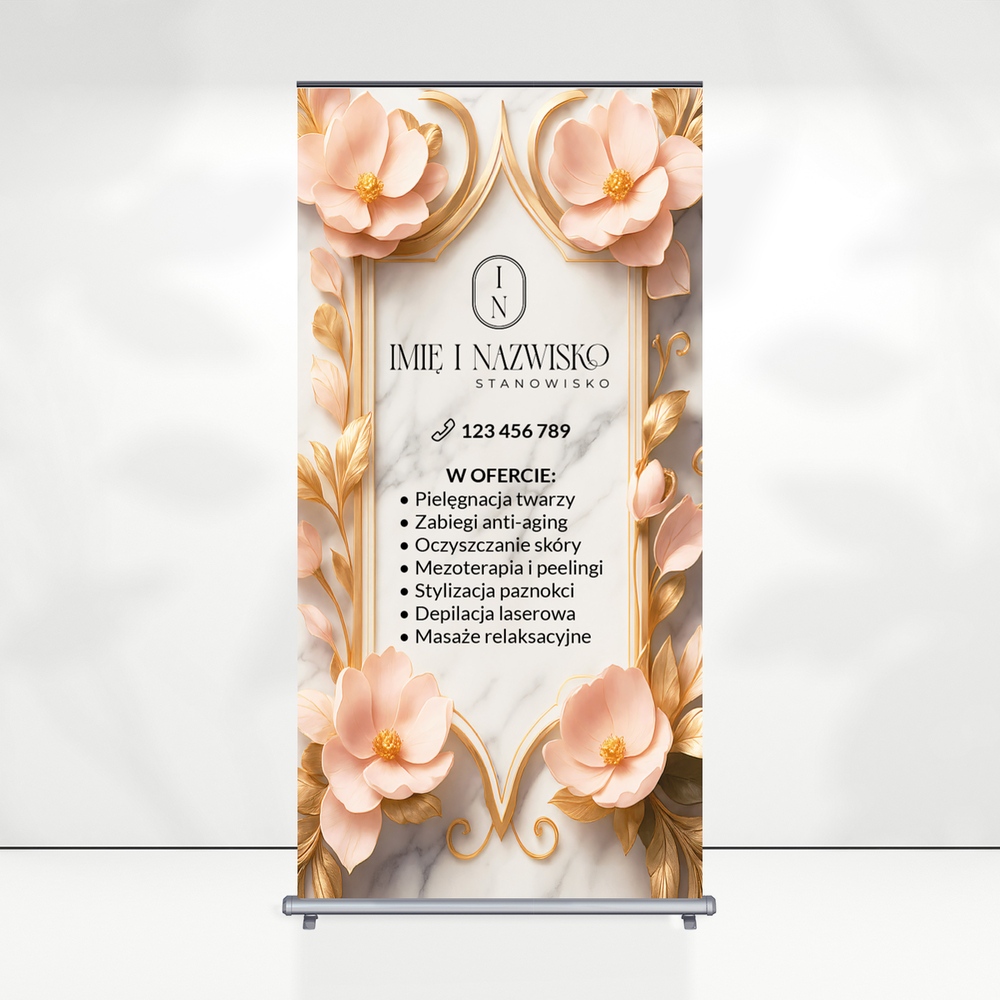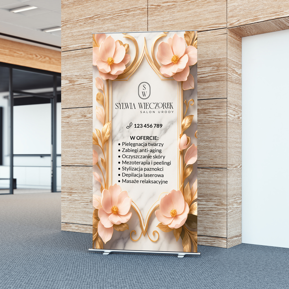 Firmowy roll up z owalnym logo i różowymi kwiatami na tle białego marmuru. Roll up przyda się w salonie kosmetycznym.