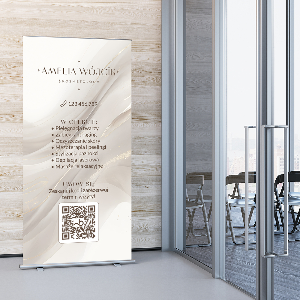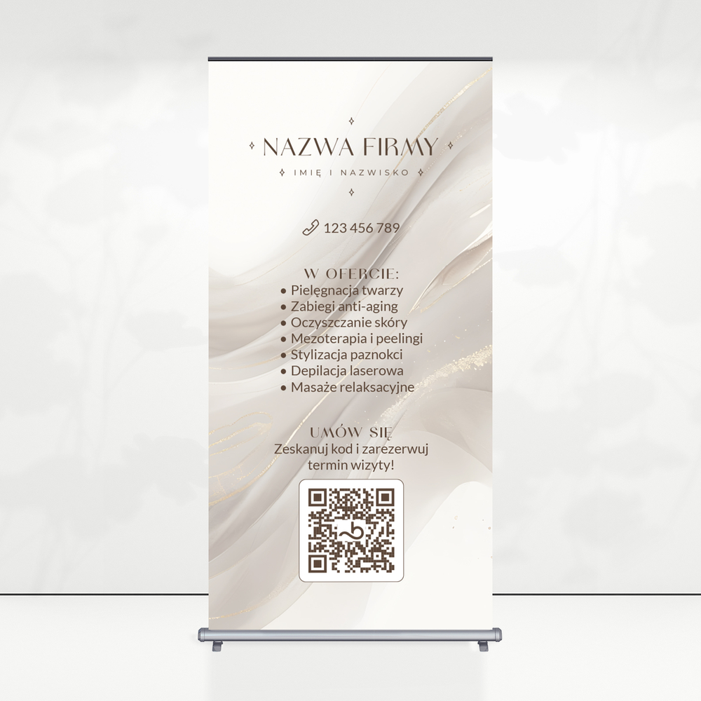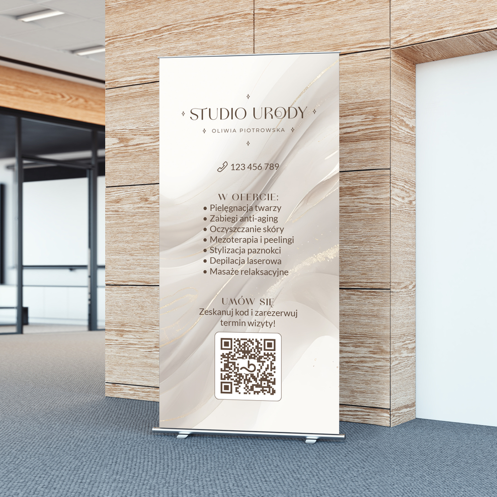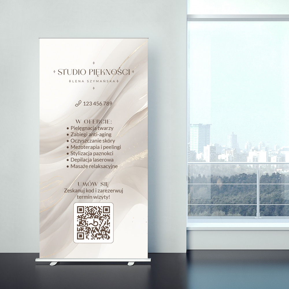 Roll up z grafiką beżowych smug. Roll up przyda się w salonie kosmetycznym.