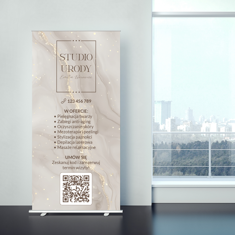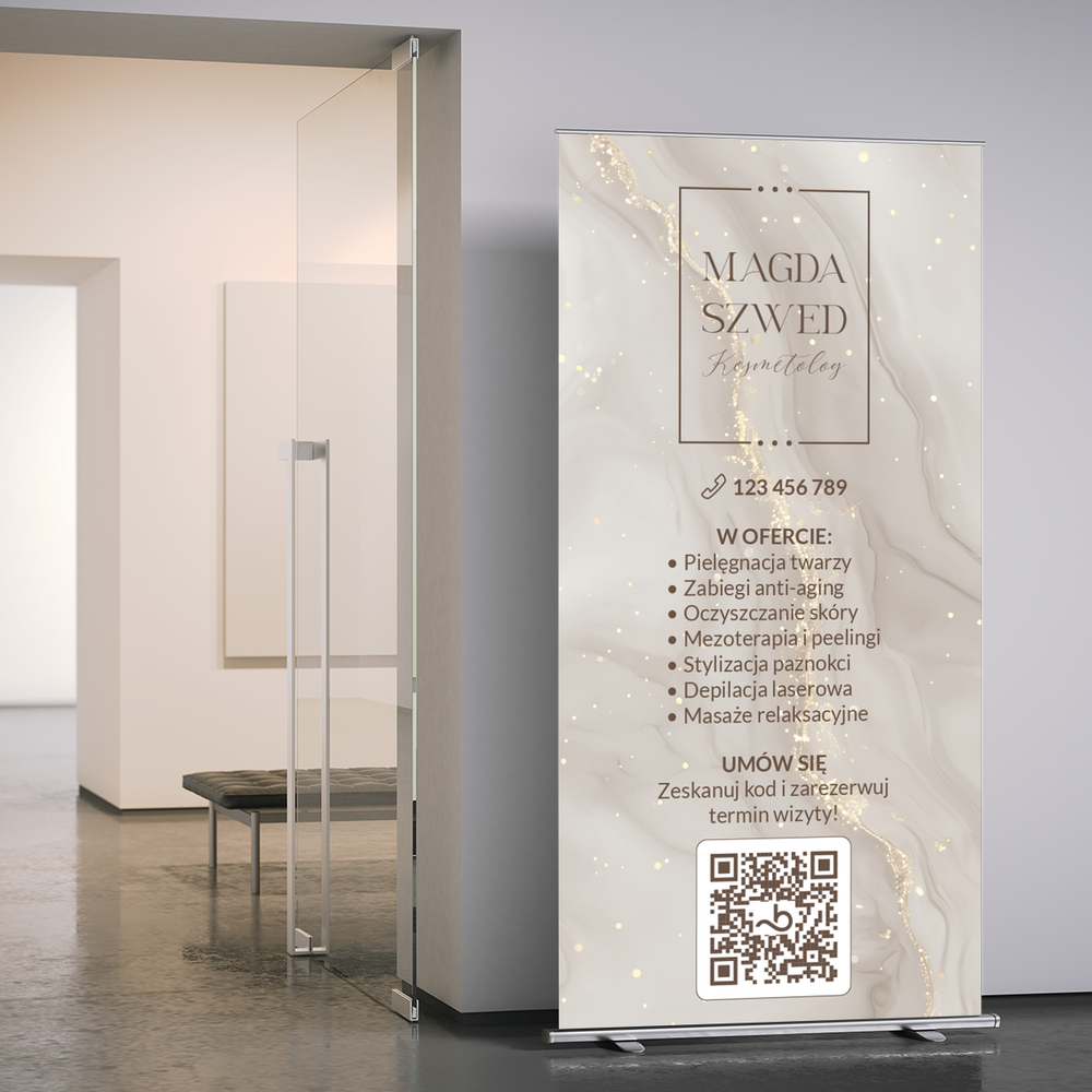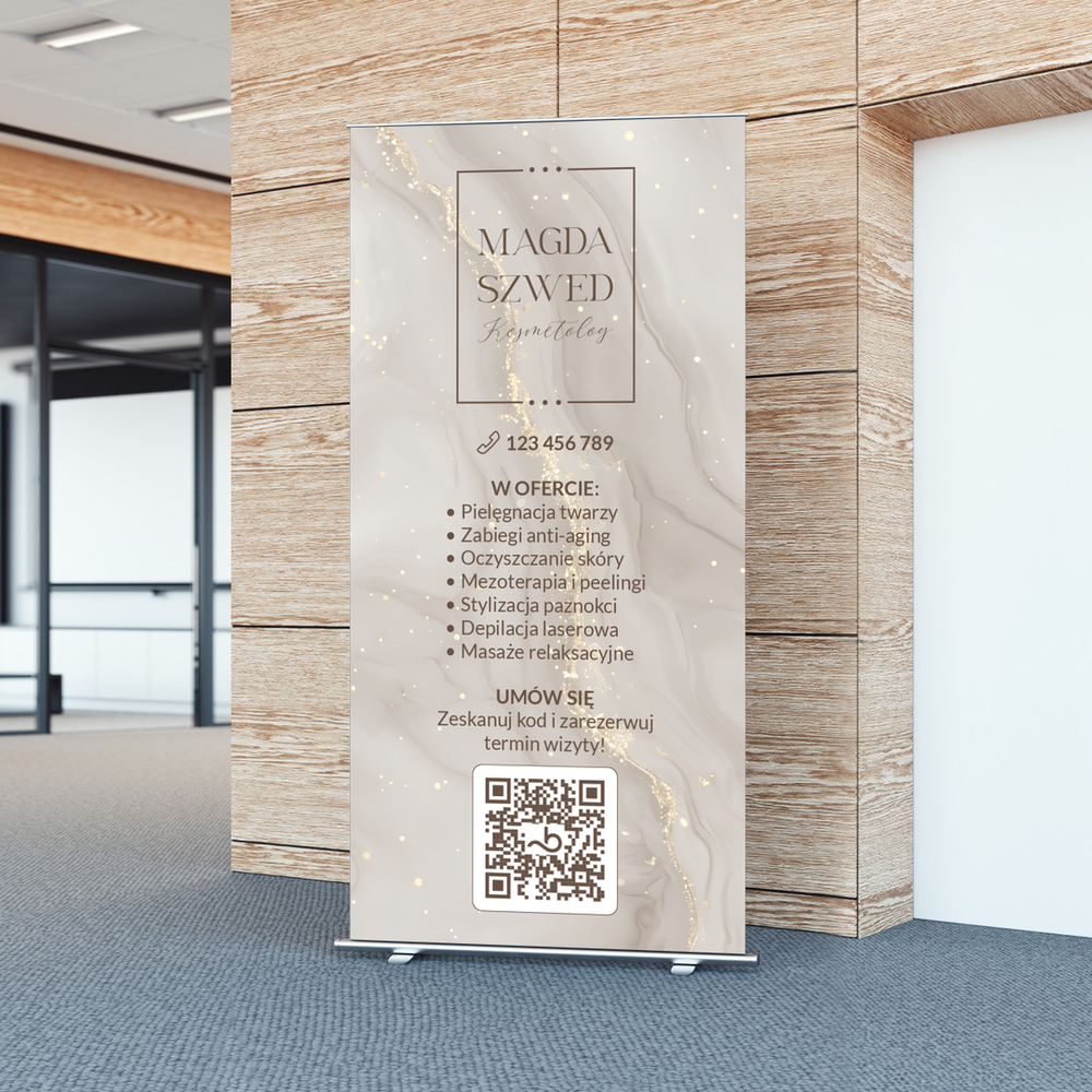 Roll up z logo firmy w prostokątnej ramce na tle beżowego marmuru. Roll up polecamy do salonu fryzjerskiego i studia urody.