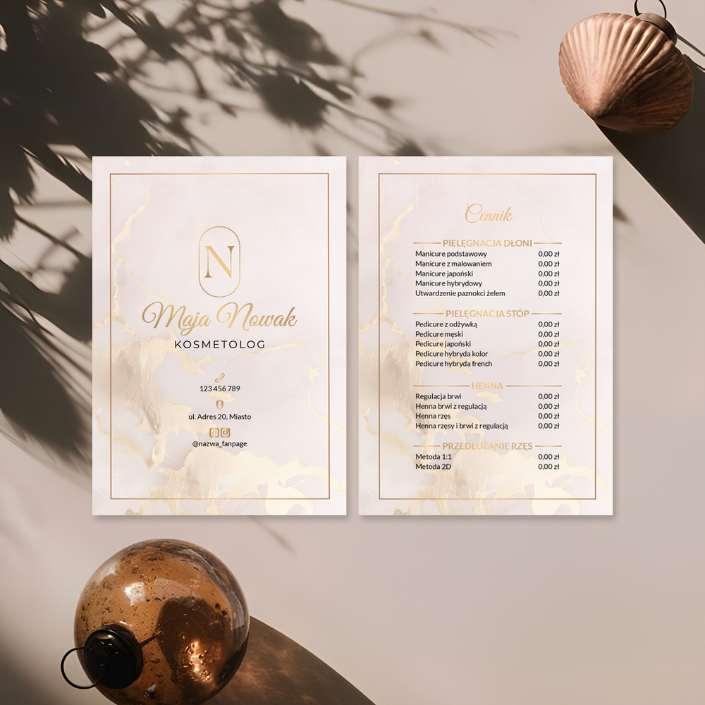 Eleganckie ulotki reklamowe z logo w owalnej ramce na tle subtelnego marmuru to idealne rozwiązanie dla salonów kosmetycznych i studiów makijażu. Delikatny marmurkowy motyw w połączeniu z klasycznym krojem pisma sprawia, że ulotki prezentują się nowocześnie i profesjonalnie, przyciągając uwagę potencjalnych klientek.