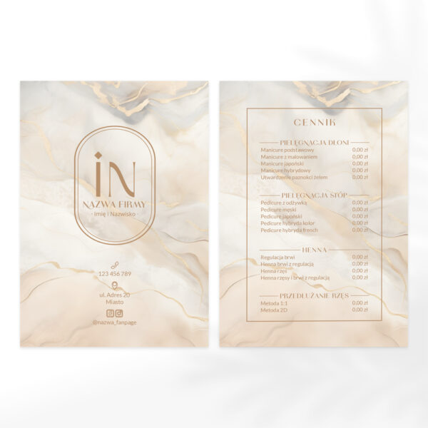 Eleganckie ulotki reklamowe z marmurowym tłem i logo w owalnej ramce to doskonały wybór dla salonu fryzjerskiego oraz stylistki paznokci. Subtelny marmurowy motyw w połączeniu z delikatnym akcentem w złotym kolorze sprawia, że ulotki wyróżniają się nowoczesnym i profesjonalnym wyglądem. To idealny sposób, aby w estetyczny sposób przedstawić ofertę i zachęcić klientki do odwiedzenia Twojego salonu.