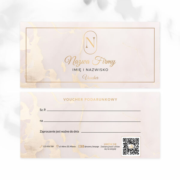 Vouchery podarunkowe z beżowym marmurem i owalnym logo w złotym kolorze. Zamówisz dla klientów swojego salonu kosmetycznego.