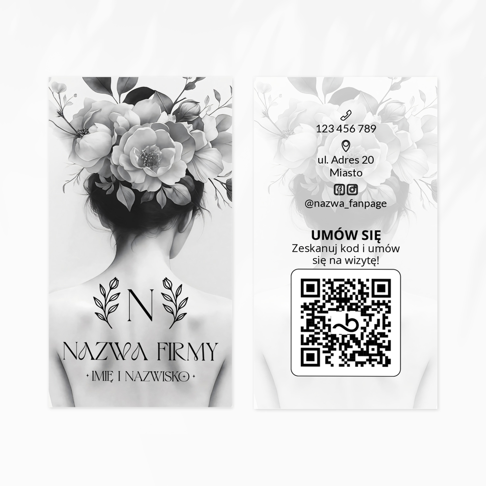 Wizytówki z ilustracją kobiety z kwiatami we włosach to przyciągający wzrok projekt dla salonów kosmetycznych i fryzjerskich. Postać z burzą roślinnych dekoracji we włosach symbolizuje kreatywność, piękno i kobiecą siłę. Układ graficzny pozwala wyeksponować logo oraz dane kontaktowe w estetyczny, spójny sposób — idealny wybór dla marek, które chcą komunikować swój styl i charakter już od pierwszego kontaktu.