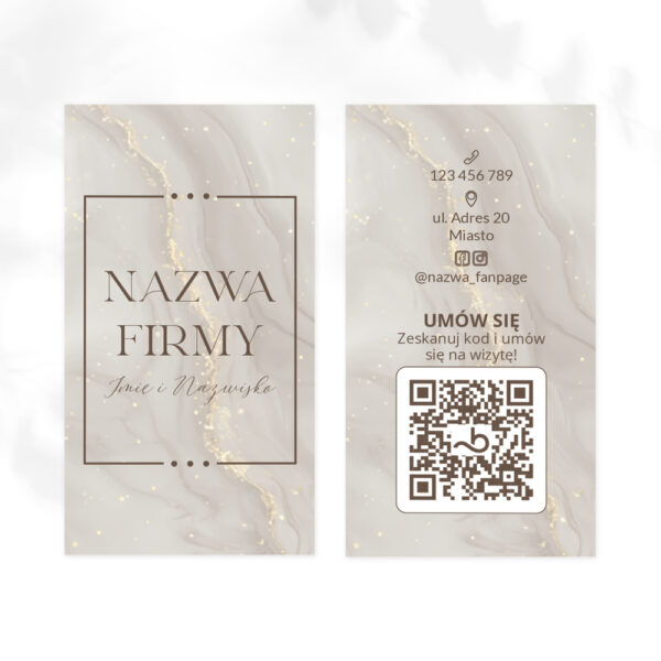 Wizytówki z beżowym marmurem i logo w prostokątnej ramce. Wizytówki polecamy do salonu fryzjerskiego i instytutu urody.