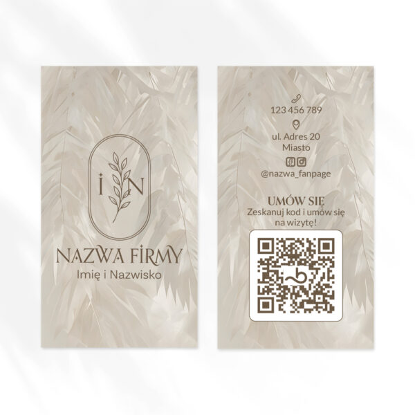 Wizytówki z brązowym logo na tle grafiki beżowych liści to eleganckie materiały reklamowe, które doskonale sprawdzą się jako skuteczna reklama dla salonu kosmetycznego i studia urody. Ich subtelne kolory i delikatny wzór nadają im wyjątkowego charakteru, który z pewnością przyciągnie uwagę potencjalnych klientów. Dzięki takiej wizytówce, salon kosmetyczny będzie mógł wyróżnić się na tle konkurencji i zyskać nowych klientów, którzy docenią elegancję i profesjonalizm reprezentowany przez ten design.